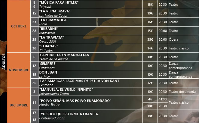 Venta de entradas sueltas para las funciones: ‘Música para Hitler’ (9 de octubre), Ópera ‘La Traviata’ (29 de octubre) y ‘Yo solo quiero irme a Francia’ (18 de diciembre), a partir del día 10 de septiembre.