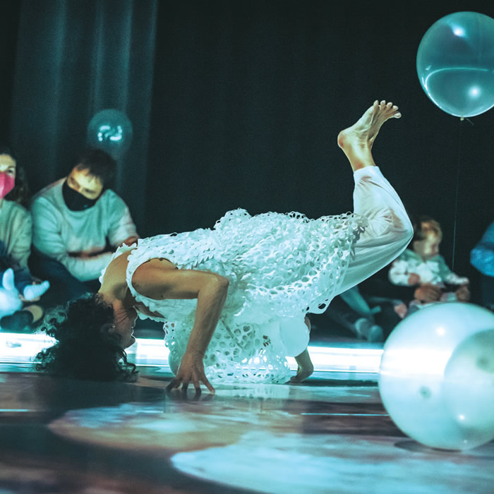 Así, la presencia de los músicos como un intérprete más, proyectados en tres grandes esferas que flotan sobre el espacio, se hibrida con las imágenes que construyen la iluminación y superficie de la escena y accionando. Entre todo ello, los intérpretes interactúan implicando al público asistente en un espacio atmosférico de imágenes, sonoridades y movimientos.
