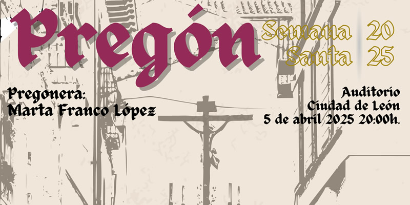 El pregón se celebrará el sábado 5 de abril de 2025 en el Auditorio Ciudad de León, a las 20:00 horas.